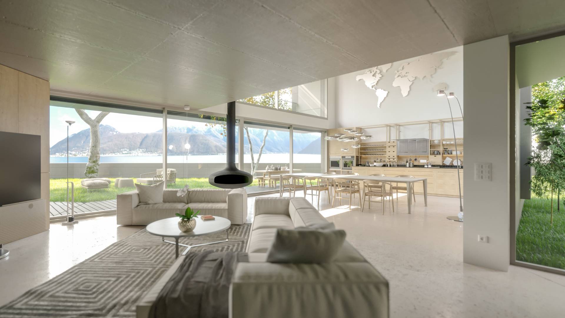 Completano la proprietà un ampio giardino di 750 mq con piscina esterna e una splendida vista lago.